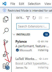 安装插件很简单,在 VS Code 中点左栏是插件(Extensions),然后搜索插件名称,如 LaTeX Utilities ,再选择安装就可以了。