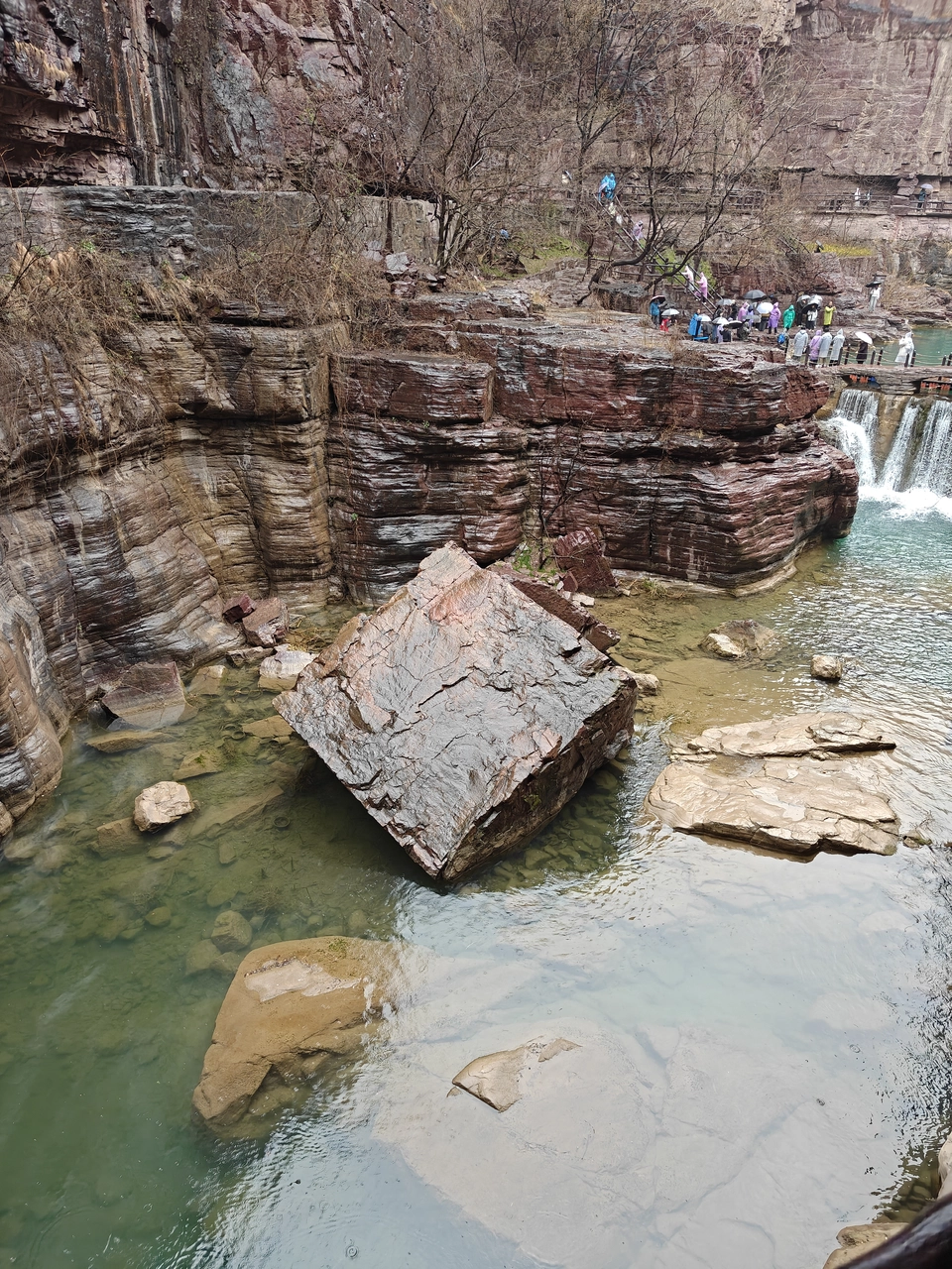 红石峡的景观还是值得一游的,穿梭在峡谷中,又是下着小雨,颇有峰回路转、曲径通幽之感,河水清澈、飞瀑喧嚣,红壁绿苔、奇石细雨,栈道起伏平缓,游客也不算多,游览起来自在惬意。